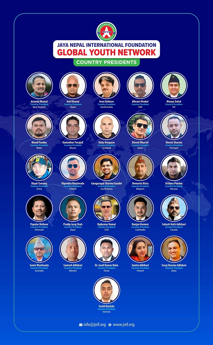 काठमाडौं । जय नेपाल अन्तरराष्ट्रिय फाउन्डेसन ग्लोबल यूथ नेटवर्कका २६ देशमा राष्ट्रिय कमिटीहरू गठन गरिएका छन् । जय नेपाल अन्तरराष्ट्रिय फाउन्डेसन ग्लोबल यूथ नेटवर्कद्वारा शनिवार भर्चुअल माध्यमद्वारा आयोजित कार्यक्रमलाई सम्बोधन गर्दै ग्लोबल यूथ नेटवर्कका अध्यक्ष मदन राज पौडेलले ४० वर्ष मुनिका ४० देशमा रहेका साथीहरूलाई जोड्ने क्रममा अहिले २६ देशमा कमिटी गठन गरिएको जनाए ।