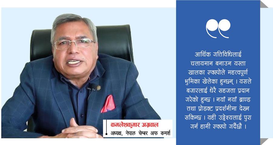 नेपाल चेम्बर अफ कमर्सले ८औं संस्करणको चेम्बर एक्स्पो आयोजना गरेको छ । भृकुटीमण्डपमा माघ १७ देखि २१ सम्म पाँच दिन एक्स्पो चल्नेछ । यसैक्रममा एक्स्पो आयोजना गर्नुको कारण लगायत विविध विषयमा केन्द्रित रहेर नेपाल चेम्बर अफ कमर्शका अध्यक्ष कमलेश अग्रवालसँग गरिएको संक्षिप्त कुराकानीः