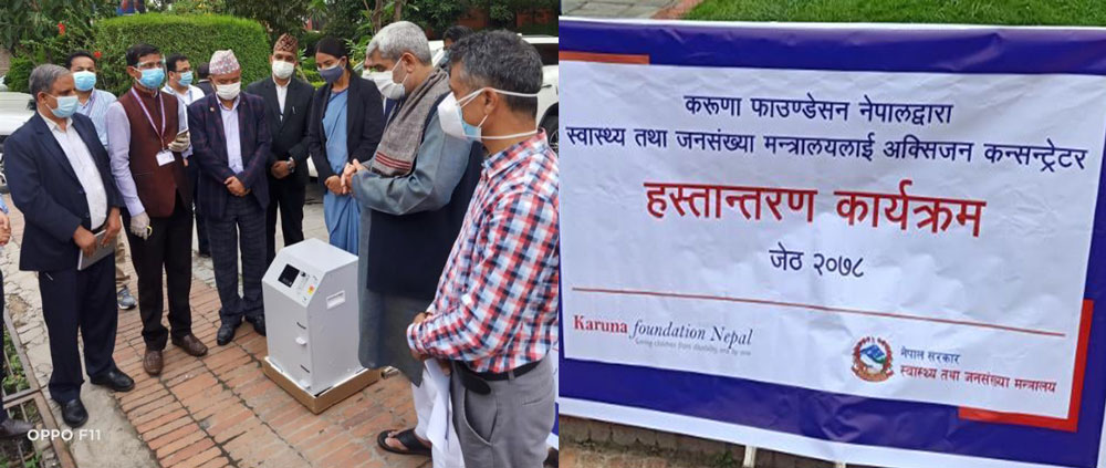 प्रदेश १ सरकारमार्फत भोजपुर, धनकुटा, पाँचथर, इलाम, सँखुवासभा जिल्ला अस्पतालहरुलाइ ३/३ थान, कोशी अञ्चल अस्पताललाइ १० थान र सुनसरी जिल्ला अस्पताल इनरुवा ५ थान हस्तान्तरण गरिएको छ । संस्थले यस अगाडि ४५ थान अक्सिजन कन्सन्ट्रेटरहरु विभिन्न अस्पतालहरुलाई सहयोग गरिसकेको छ ।