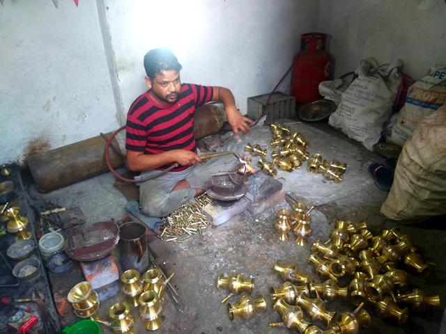 सुन्दरहरैँचा । मोरङको सुन्दरहरैँचा नगरपालिकास्थित सलकपुरको एक उद्योगमा पुरानो पित्तलको समान प्रशोधन गरी करूवा बनाउँदै श्रमिक । तस्बिर : मणिराम दाहाल/रासस