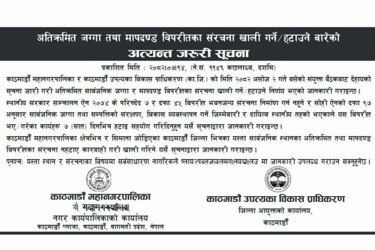 काठमाडौं । काठमाडौं महानगरपालिका र काठमाडौं उपत्यका विकास प्राधिकरणले सार्वजनिक जग्गा अतिक्रमण र मापदण्डविपरीत बनेका संरचना हटाउन ७ दिने समयसीमा दिँदै अत्यन्त जरुरी सूचना प्रकाशित गरेका छन् ।
