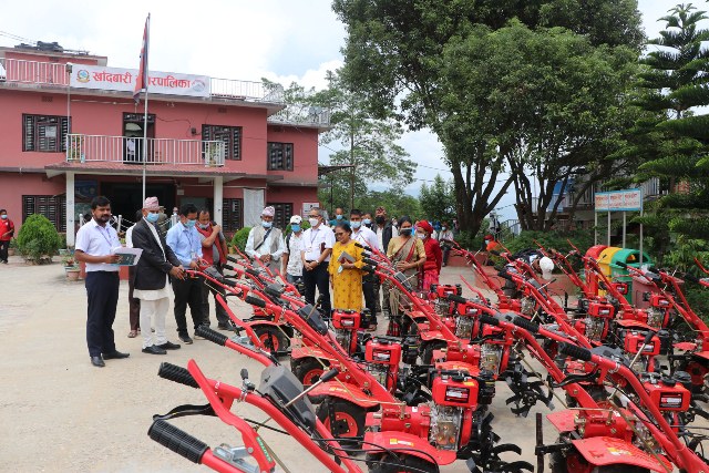 किसानलाई व्यावसायिक कृषि खेतीमा आकर्षित गर्न अनुदानमा मिनीटिलर वितरण गरिएको नगरप्रमुख मुरारीप्रसाद खतिवडाले बताए । उनले लगानी खेर नफाली उत्पादन वृद्धि गर्दै आर्थिक उपार्जनतर्फ लाग्न आग्रह गरे ।