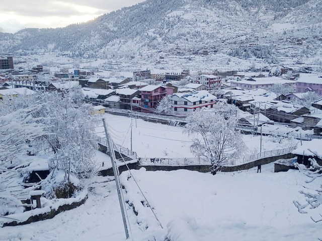 खलंगा । हिउँले सेताम्मे जुम्ला सदरमुकाम खलङ्गा बजार । शुक्रबारदेखि परेको निरन्तर हिमपातले यहाँका किसानले लगाएका हिउँदे बालीनालीलाई निकै फाइदा गर्ने भएपछि जिल्लाका किसानमा खुसी छाएको यहाँका स्थानीयवासी बताउँछन् । तस्वीर : विजय रावत/रासस