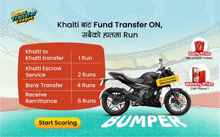 खल्तीबाट खल्तीमा ट्रान्स्फर गर्दा १ रन , खल्ती एस्क्रो प्रयोग गर्दा २ रन , खल्तीबाट बैंक खातामा ट्रान्स्फर गर्दा ४ रन , र विदेशबाट पठाएको रेमिट्यान्स प्राप्त गर्दा ६ रन बनाउन मिल्ने, र यि रनहरु जम्मा गरी ६ रनमा दैनिक ६ एनपिएल को टिकट , ५० रनमा हरेक हप्ता सि एम एफ फोन १ र १०० रनमा बम्पर पुरष्कार स्वरुप बजाजको पल्सर एन१६० डुअल एबिएस जित्ने मौका प्राप्त गर्न सकिन्छ ।