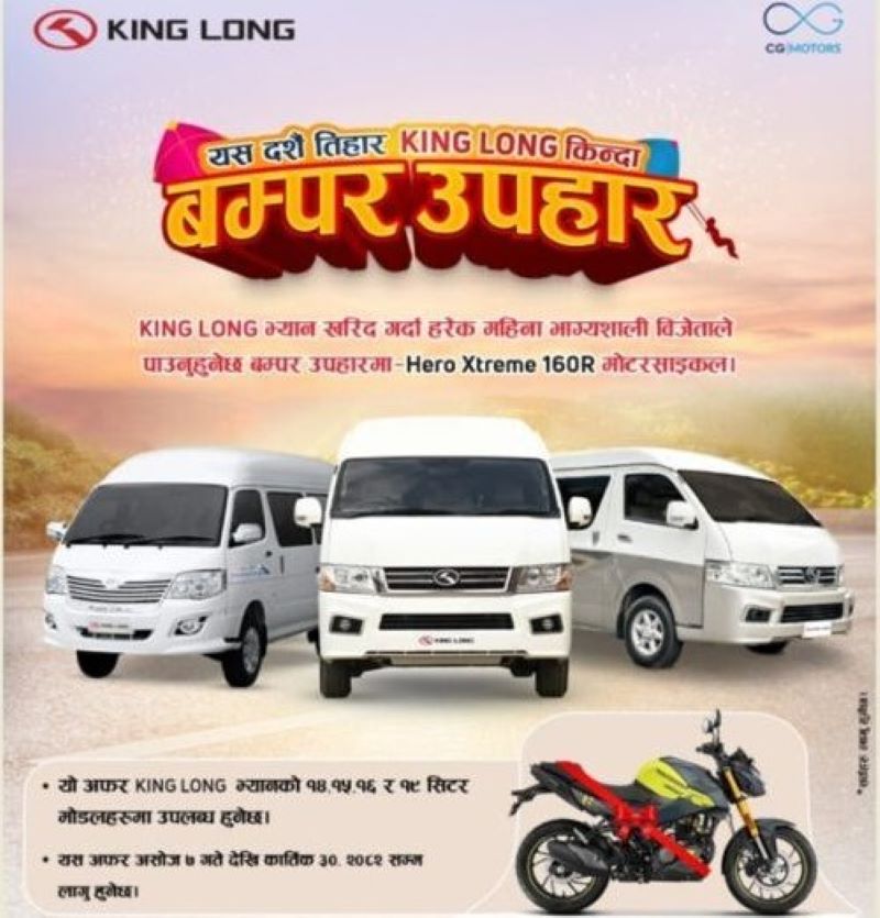 यो अफर किङलङ ईभी भ्यानका १४, १५, १६ र १९ सिटर मोडलहरुमा लागु हुनेछ । असोज ७ देखि आगामी कात्तिक ३० गतेसम्म सो ईभी भ्यान खरिद गर्ने ग्राहकले यो अवसर पाउने कम्पनीले जनाएको छ ।