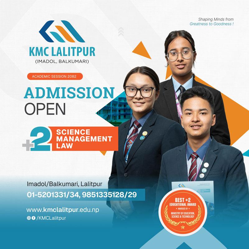 काठमाडौं । तपाईं २०८१ को एसईई उत्तीर्ण भएर कक्षा ११ मा भर्ना हुने सोचमा हुनुहुन्छ भने तपाईंको लागि उपयुक्त गन्तव्य बन्न सक्छ केएमसी ललितपुर । नेपालका उत्कृष्ट शैक्षिक संस्थाहरुमध्ये अग्रणी पहिचान बनाउन सफल ‘काठमाडौं मोडल सेकेण्डरी स्कुल’ ललितपुर (केएमसी ललितपुर) ले ‘प्लस टु’मा विज्ञान, व्यस्थापन र कानून संकायको पठनपाठन गराउँदै आइरहेको छ ।