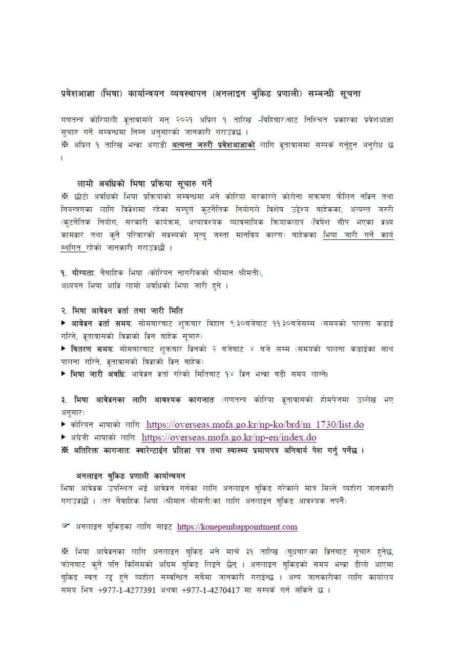 बैबाहिक भिसा (कोरियन नागरिकको श्रीमान तथा श्रीमती) र अध्ययन भिसा जारी गर्ने दुताबासले जनाएको छ । २०२१ अप्रिल १ देखि भिसाका लागि आवेदन दिन सकिने दुताबासले जनाएको छ ।