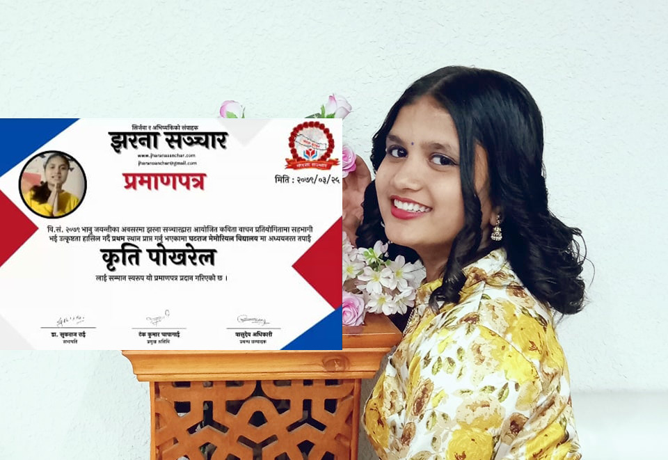 काठमाडौं । घटराज मेमोरियल स्कुलका विद्यार्थी कृति पोखरेल कविता प्रतियोगितामा प्रथम भएकी छन् ।