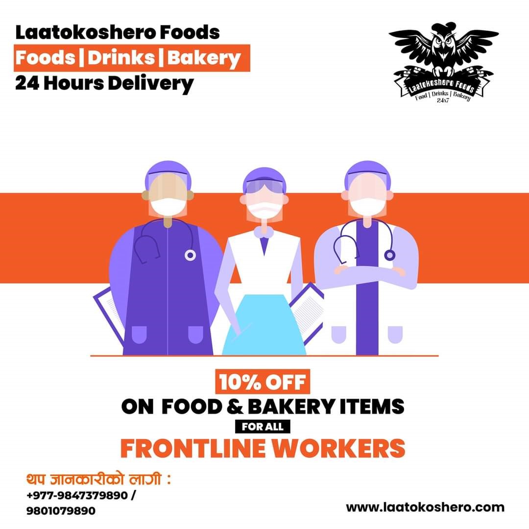 कोभिड तथा लकडाउनकाृ यो समयमा लाटोकोसेरोले उपत्यका को जनसुखै ठाउँमा डेलिभरी साथै हरेक फुड र बेकरी आइटममा फ्रन्टलाइन वर्कसहरु जस्तै स्वास्थ चिकिस्सक, नर्स, ह्ेल्थ वर्कस, प्रहरी, ट्राफिक प्रहरी, फार्मेसिस्ट, अस्पतालका कर्मचारी साथै कोभिडको यो समयमा निरन्तर खटिरहेका सम्पूर्णलाई, १० ५ छुट दिने ब्यवस्था रहेको यँहाका प्रबन्ध निर्देशक प्रज्ज्वल कुमार दाहालले जनाएका छन ।