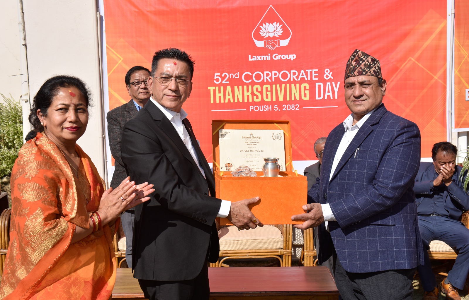 काठमाडौं । लक्ष्मी ग्रुप प्रा.लि.ले आफ्नो ५२ औं स्थापना दिवस शनिबार एक समारोहको आयोजना गरि मनाएको छ । बटुकद्वारा स्वस्ती वाचन एवम् ग्रुपका कार्यरकारी निर्देशक सुनिल श्रेष्ठले पानसमा दीप प्रज्वलन गरि सुरुवात गरिएको कार्यक्रममा कम्पनिमा ५, १०, १५ , २०, र ३० वर्ष सेवा गर्ने २१ जना कर्मचारीलाई सम्मान गरिएको थियो ।