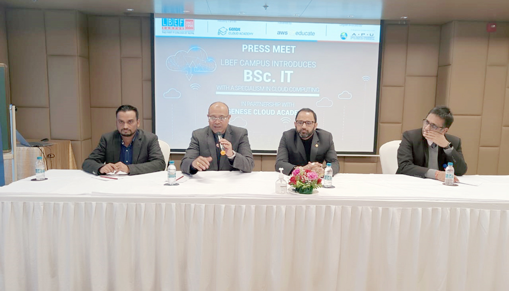 काठमाडौं । नेपालको पहिलो आइटी कलेज लर्ड बुद्ध एजुकेसन फाउण्डेसन (एलबीईएफ) क्याम्पसले बेलायतको जेनेस क्लाउड एकेडेमीसँग सहकार्य गर्ने भएको छ । साझेदारी कार्यक्रम अन्तर्गत विद्यार्थीले बीएससी आइटी (आनर्स)को साथै जेनेस क्लाउड एकेडेमीको सहकार्यमा क्लाउड कम्प्युटिङको सैद्धान्तिक तथा व्यवहारिक ज्ञान प्राप्त गर्ने एल.बी.ई.एफ. ग्रुप अफ इन्स्टिच्युसनका अध्यक्ष ई. पंकज जालानले बिहीबार आयोजित पत्रकार सम्मेलनमा जानकारी दिए ।