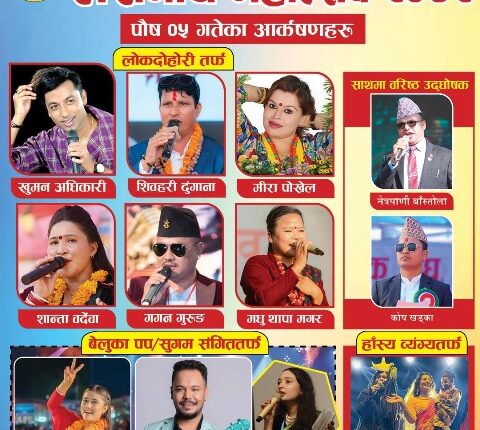 महोत्सवमा आज लोकदोहोरी कलाकारहरु खुमन अधिकारी, मिरा पोख्रेल, शान्ता वर्देवा, मधु थापा मगर, गगन गुरुङ र शिवहरी ढुंगानाले प्रस्तुती दिनेछन भने हाँस्यव्यग्यतर्फ राजेन्द्र गिरी (गुन्द्रुके) र बेलुका सुगम संगिततर्फ रचना रिमाल र डेभीड शंकरले प्रस्तुती रहने कलाकार संयोजक भरत कुमार अधिकारीले जानकारी दिए ।