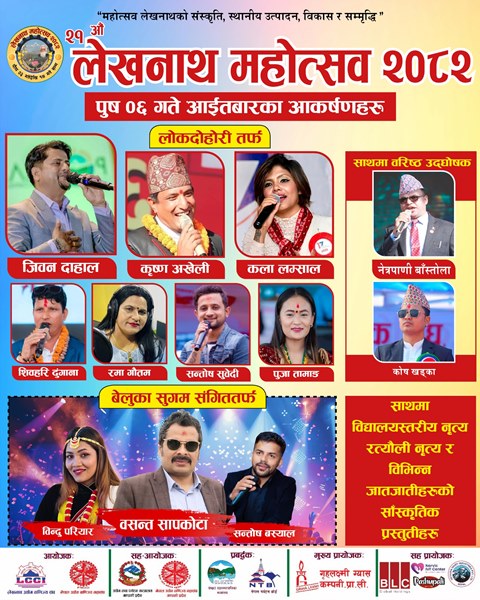 लेखनाथ । महोत्सव लेखनाथको संस्कृति, स्थानीय उत्पादन विकास र समृद्धि’’ भन्ने मुल नाराका साथ लेखनाथ उद्योग वाणिज्य संघको आयोजनामा लेखनाथ महोत्सव जारी छ ।