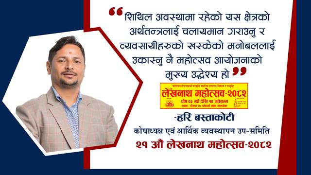 लेखनाथ । लेखनाथ उद्योग वाणिज्य संघले आयोजना गर्न लागेको २१ औं लेखनाथ महोत्सवको तयारी तीव्र पारिएको छ । विगत २०६१ साल देखि अनवरत रुपमा सञ्चालन हुदै आइरहेको महोत्सवले स्थानीयस्तरमा उत्पादित वस्तुको बजार प्रवद्र्धन, कृषिजन्य लघु, घरेलु तथा साना उद्योगबाट उत्पादित वस्तुको प्रबद्र्धन, आवश्यक ज्ञान, उद्यमशीलता र प्रवधि हस्तानतरण गर्न सहयोग पु¥याउने र स्वदेशी तथा विदेशी बजार विस्तारमा सहयोग पु¥याउने उद्देश्यले महोत्सव आयोजना गरिएको हो ।