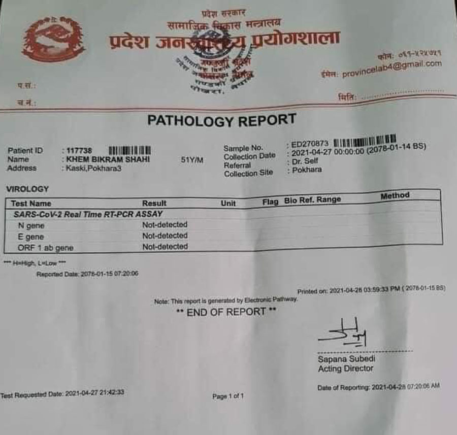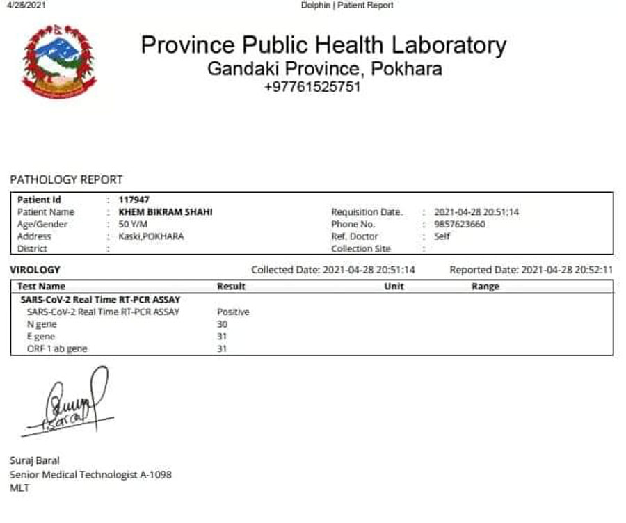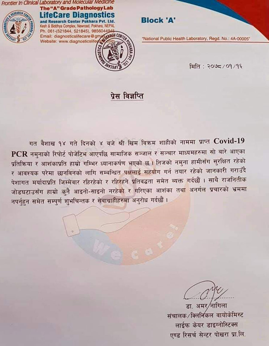यस विषयमा डाक्टर नागिला भन्छन्, सांसद खिम विक्रम शाहीको स्वाब जाचँ गर्दा गण्डकी प्रदेशको ल्याबबाट नेगेटिभ रिजल्ट आयो तर लाइफ केयर डाइग्नोस्टिक्सको ल्याबबाट रिजल्ट पोजेटिभ आयो । त्यसपछि फेरि तेस्रोपटक उनको स्वाब गण्डकी प्रदेश ल्याबमा पठाउँदा पोजेटिभ आएपछि प्रदेश ल्याब र लाइफ केयर डाइग्नोस्टिक्स ल्याबको रिजल्ट मिल्न पुगेको छ ।