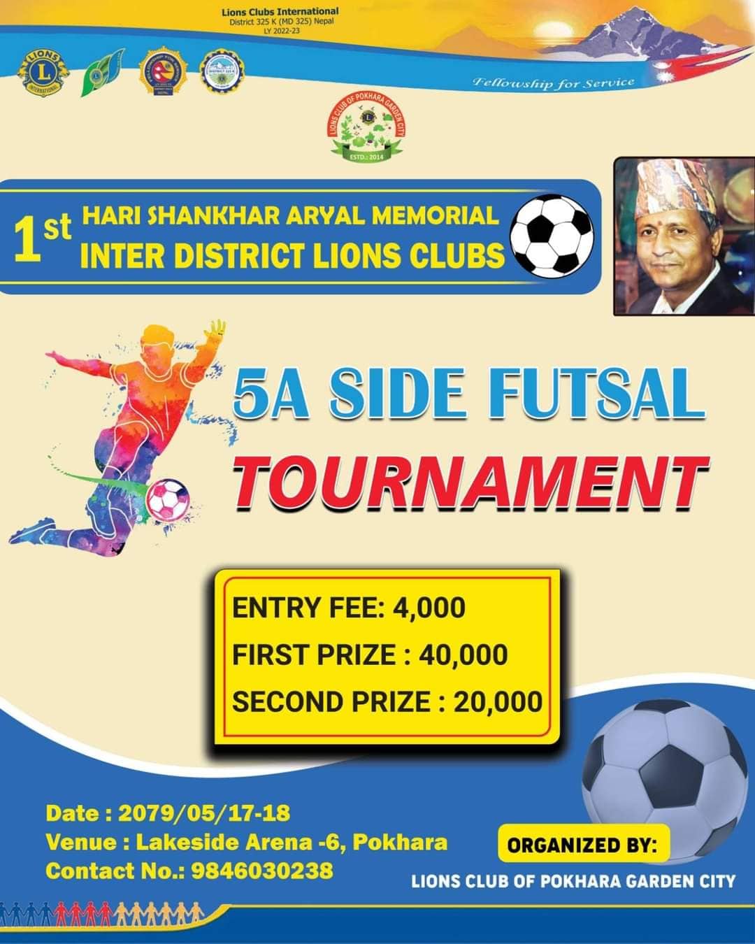 पोखरा । प्रथम स्व हरिशंकर अर्यालको स्मृतिमा अन्तर्गत इन्टर डिष्ट्रिक्ट लायन्स क्लब 5A फुट्सल प्रतियोगिता हुने भएको छ ।