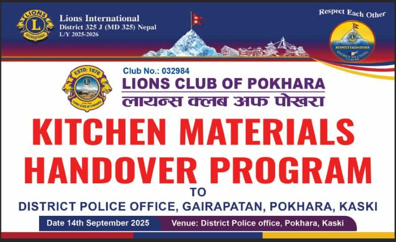 पोखरा । लायन्स क्लब अफ पोखराले जिल्ला प्रहरी कार्यालयलाई भान्साका सामग्री सहयोग गरेको छ । जेनजी आन्दोलनमा पूर्ण रुपमा जलेर नष्ट भएको प्रहरी कार्यालयलाई रु १ लाख बराबरको भान्साका सामग्री सहयोग गरेको क्लबका अध्यक्ष देवेन्द्र नकर्मीले जानकारी दिए ।