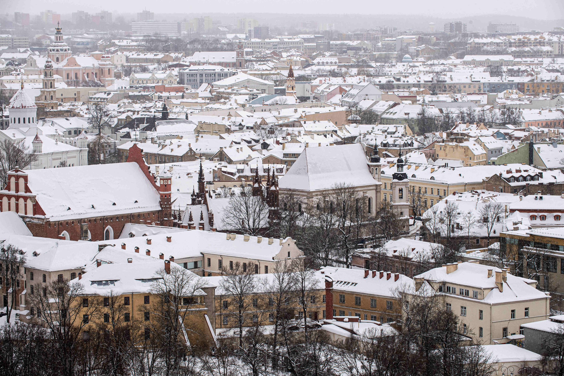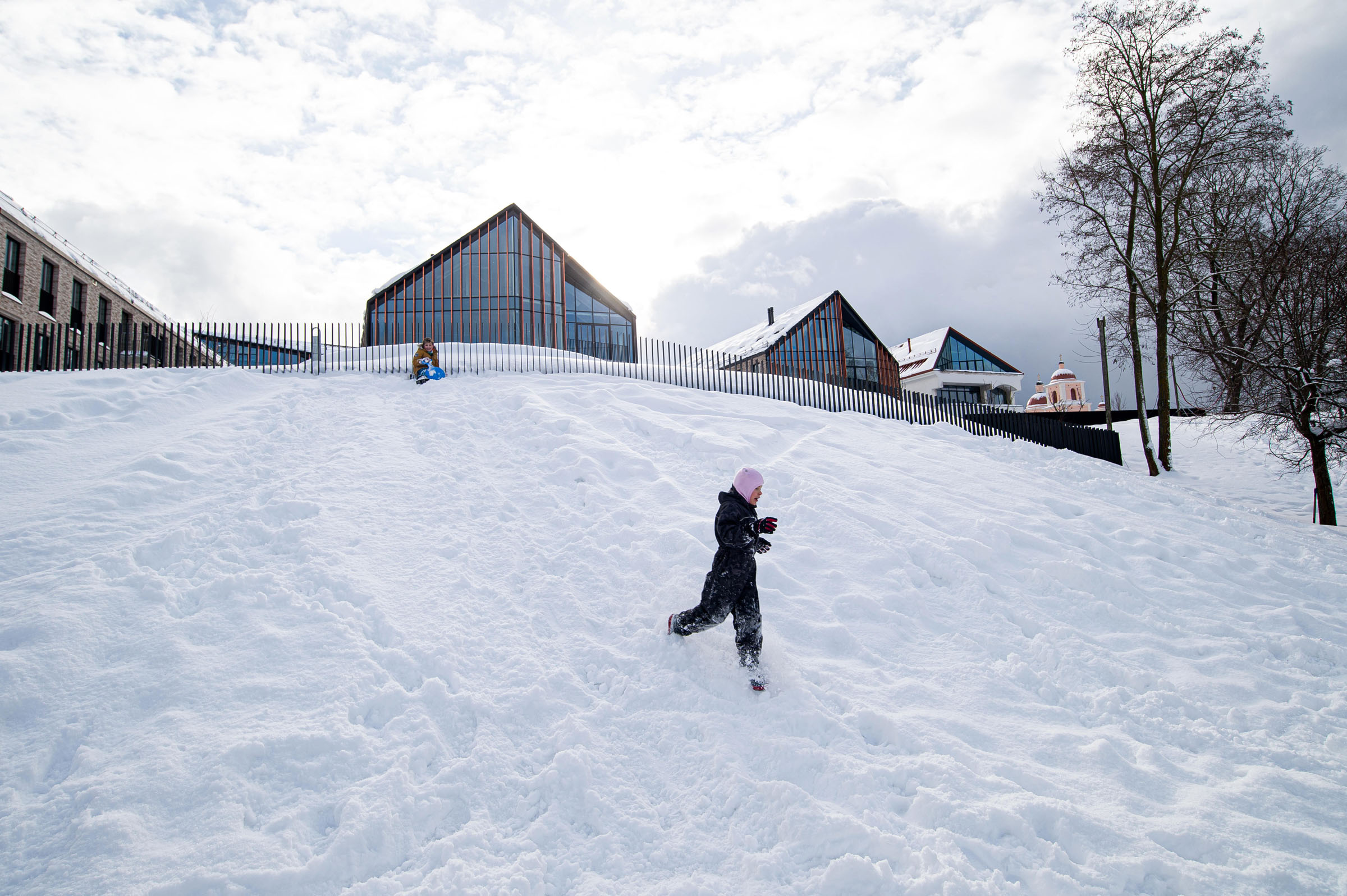 A child has fun in the snow in Vilnius, Lithuania, on Feb. 14, 2021. Photo taken on Feb. 14, 2021 shows the Old Town covered with snow in Vilnius, Lithuania. photo : XINUHA