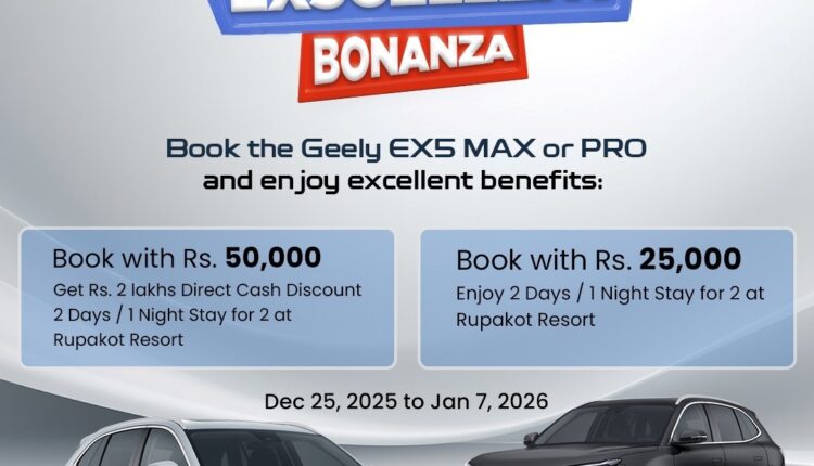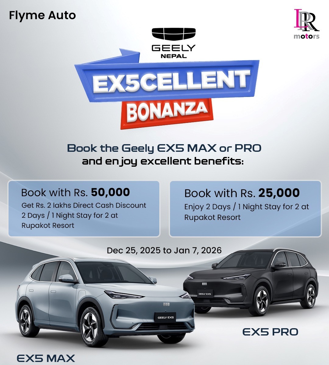 काठमाडौं । नेपालमा जिली EX5 MAX र PRO विद्युतीय गाडीको आधिकारिक आयातकर्ता एलआरआर मोटर्सले क्रिसमस तथा अंग्रेजी नयाँ वर्ष २०२६ को अवसरमा ‘EX5cellent Bonanza’ बिक्री योजना सार्वजनिक गरेको छ ।