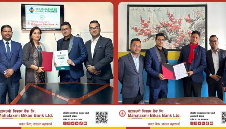 काठमाडौं । २८ वर्षदेखि सरल, सहज र गुणस्तरिय वित्तीय सेवा प्रदान गर्दै आईरहेको महालक्ष्मी विकास बैंक लिमिटेडले शैक्षिक क्षेत्रसँग समन्वय गरी अगाडि बढ्ने अभिप्रायका साथ हिमालयन ह्वाइट हाउस इनटरनेशनल कलेज र शुभश्री कलेज अफ म्यानेजमेन्टसँग सम्झौता गरेको छ ।