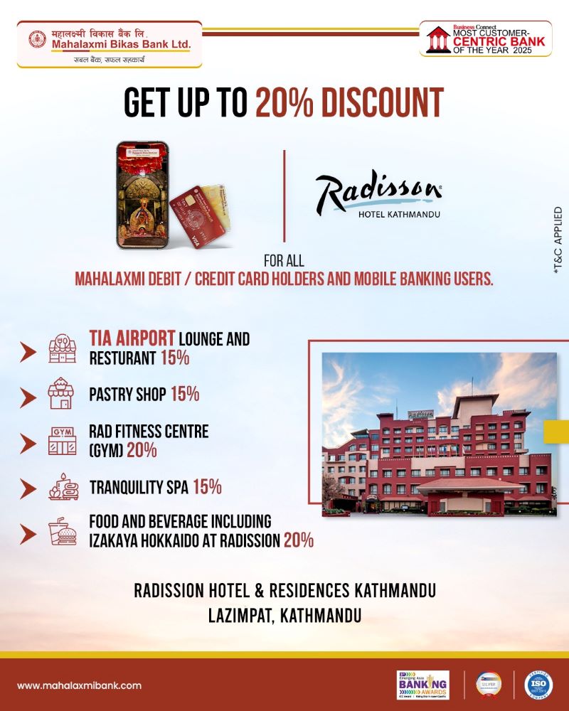 काठमाडौं । महालक्ष्मी विकास बैंकका ग्राहकलाई र्याडिसन एयरपोर्ट लाउन्जमा विशेष छुट दिइने भएको छ ।