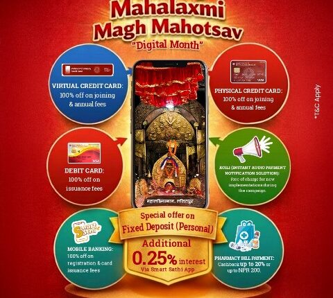 त्यसैगरी “महालक्ष्मी माघ महोत्सव” लाई थप उत्साहमय बनाउन भर्चुअल तथा साधारण क्रेडिट कार्ड जारी गर्दा तथा वार्षिक शुल्कमा १०० प्रतिशत छुट प्रदान गर्नेछ । साथै, डेबिट कार्ड जारी गर्दा तथा मोबाइल बैकिङ दर्ता गर्दा १०० प्रतिशत छुट प्रदान गर्नेछ । ग्राहकले मोबाइल एप मार्फत फार्मेसीको बिल भुक्तानी गर्दा बिल रकमको २० प्रतिशत वा रु. २०० सम्मको क्यासब्याक प्राप्त गर्नेछन् । अडियो मार्फत भुक्तानी प्राप्त भए नभएको सुचना प्रदान गर्ने “कोइली” दर्ता गर्दा समेत शुल्क लाग्ने छैन । यो अभियान २०८२ साल माघ महिनाको लागि मात्र लागु हुनेछ ।