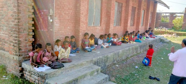 जलेश्वर । महोत्तरी जिल्लाको मनरासिस्वा नगरपालिका– १० स्थित प्राथमिक विद्यालय मधवामा भवन अभावमा बरण्डामा पढ्दै विद्यार्थी । तस्वीर : सञ्जीतकुमार मण्डल/रासस