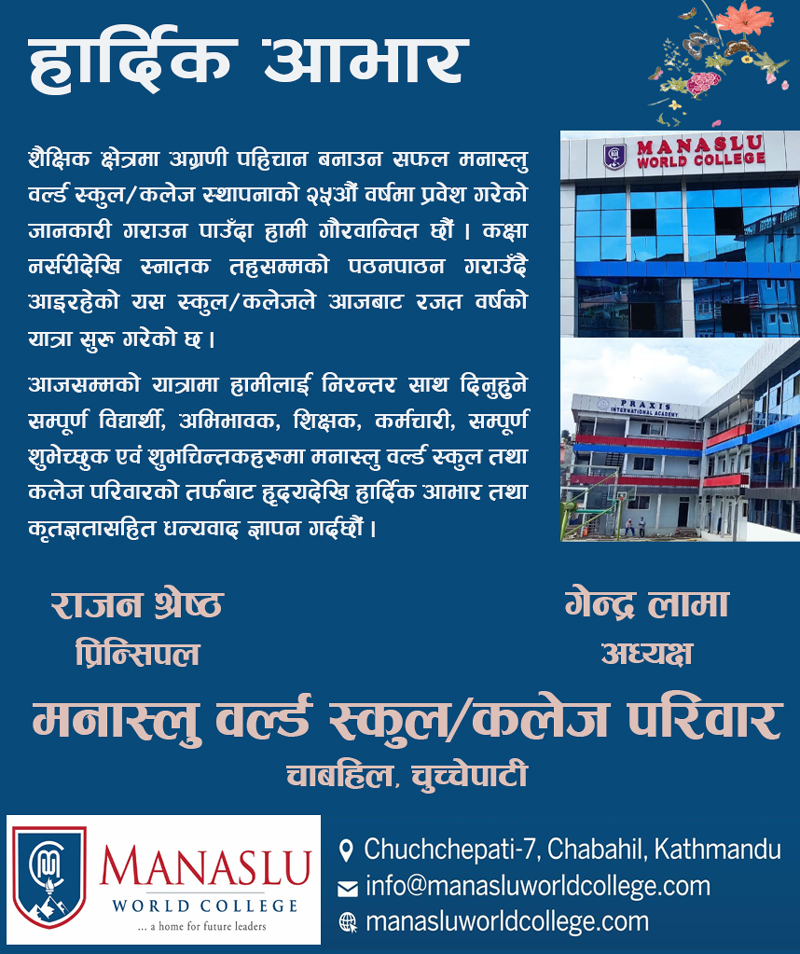 मनास्लु वर्ल्ड स्कुल तथा कलेज स्थापनाको रजत वर्षमा प्रवेश गरेको छ । बिगतमा प्राक्सिस इन्टरनेशनल एकेडेमी नामबाट स्कुल सञ्चालनमा रहेकोमा हाल मनास्लु नामबाटै सञ्चालनमा छ । कलेजका अध्यक्ष गेन्द्र लामाको अध्यक्षतामा तथा संघीय मामिला तथा सामान्य प्रशासन मन्त्री अमनलाल मोदीको प्रमुख आतिथ्यतामा आयोजित विशेष कार्यक्रमबीच मनास्लुले सोमबार वार्षिकोत्सव मनाएको हो ।