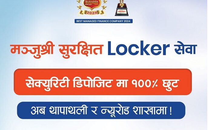 काठमाडौं । मन्जुश्री फाईनान्स लिमिटेडले आफ्ना ग्राहकवर्गको माझ मन्जुश्री सुपर सेफ लकरको सुबिधा ल्याएको छ । हाललाई यो सुबिधा फाईनान्सको कर्पोरेट शाखा थापाथली र न्युरोडमा उपलब्ध गराइएको छ । साथै ग्राहकहरुको सहजताका लागि मन्जुश्रीले बिना कुनै सेकुरिटी डिपोजीटनै यो सेवा प्रदान गर्ने छ ।