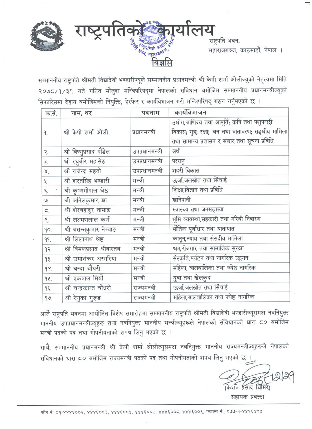यस्तो बन्यो नयाँ मन्त्रीमण्डल, नवनियुक्त मन्त्रीहरुले लिए सपथ