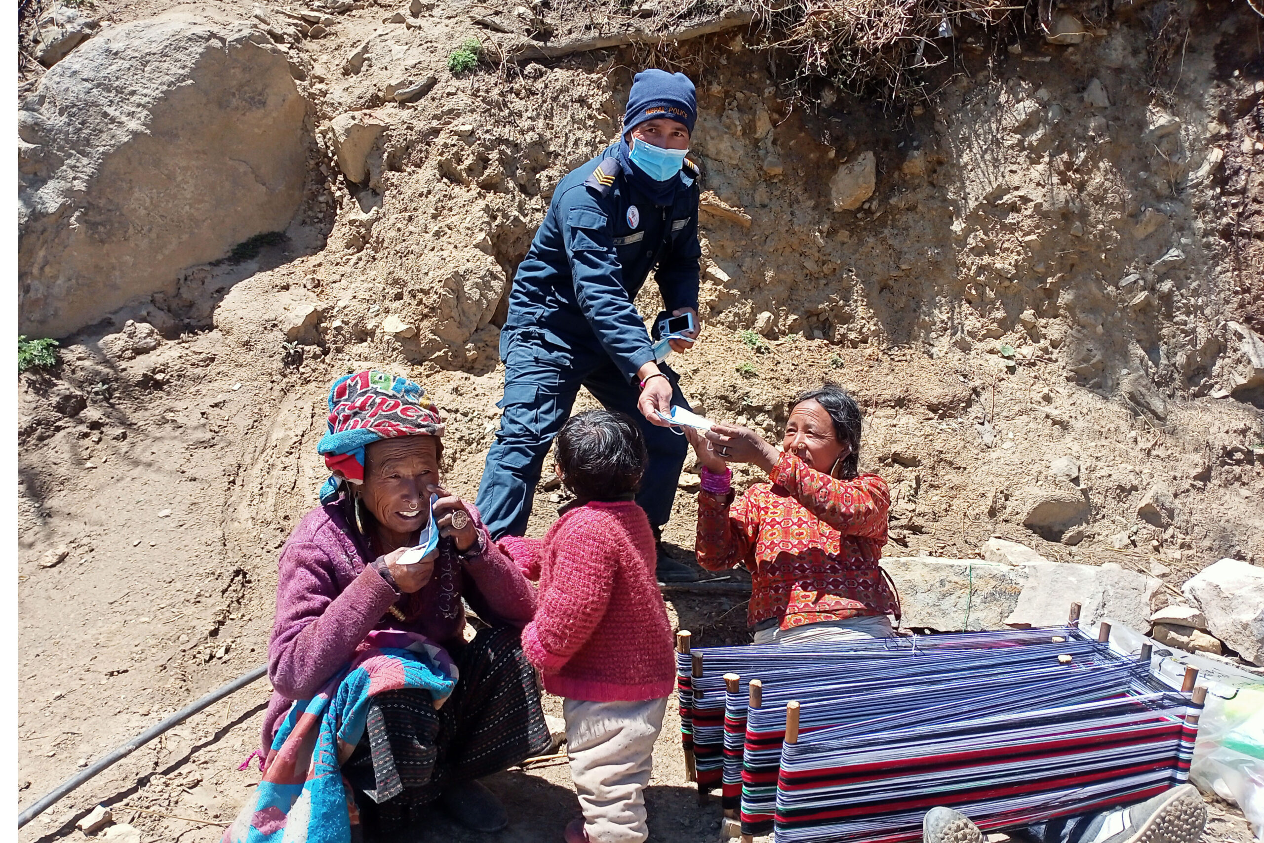 कोरोना भाइरसको सङ्क्रमणबाट बच्न हुम्लाको सिमकोटका स्थानीयलाई मास्क वितरण गर्दै नेपाल प्रहरी ।