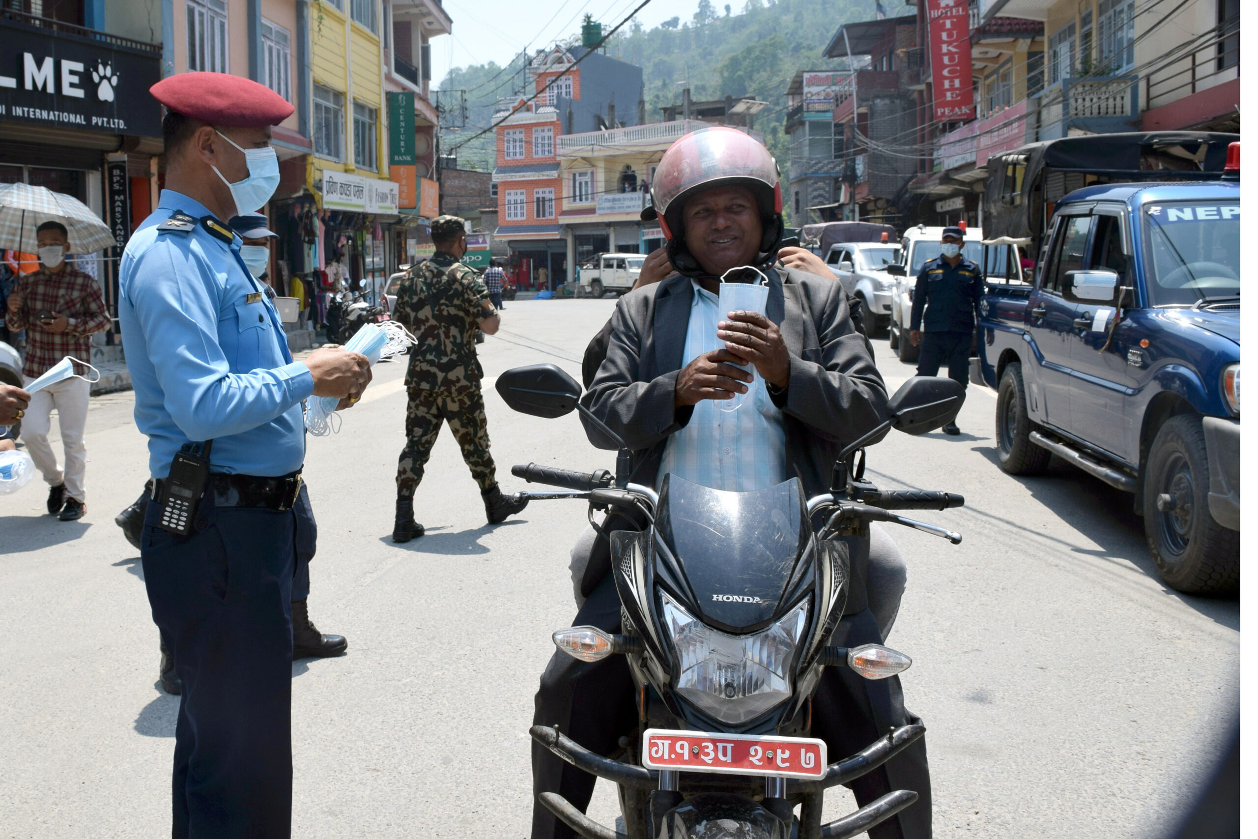 मास्क नलगाई सवारी चलाएका नेपाली काँग्रेस जिल्ला कार्य समिति लमजुङका सचिव हरिप्रसाद बराललाई सोमबार बेँसीशहर बजारमा मास्क प्रदान गर्दै जिल्ला प्रहरी कार्यालयका प्रहरी नायव उपरीक्षक गङ्गाबहादुर थापा । जिल्लामा कोरोना भाइरसको सङ्क्रमण बढ्दै गएतापनि बुद्धिजिवी, उच्च ओहोदाका व्यक्ति र सर्वसाधारण विनामास्क हिँड्डुल गरिरहेका छन् ।