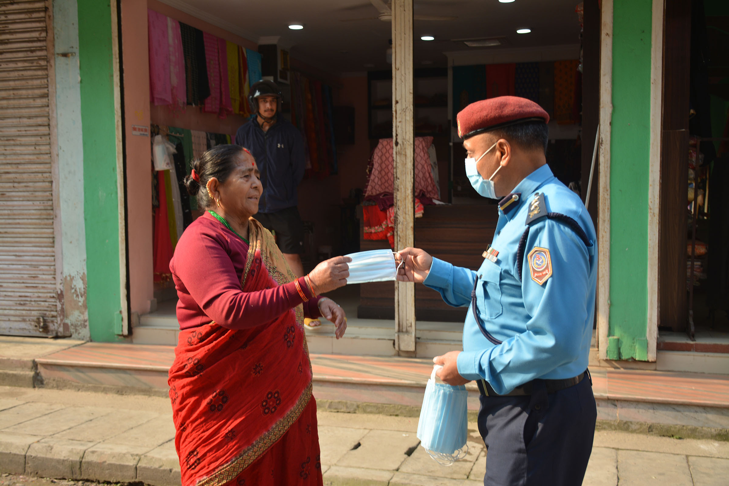 जिल्ला स्वास्थ्य कार्यालय तनहुँ र जिल्ला प्रहरी कार्यालय तनहुँले सोमबारदेखि शुरु गरेको तपाईंको मास्क खै ? अभियानअन्तर्गत दमौलीमा सर्वसाधारणलाई मास्क वितरण गर्दै प्रहरी उपरीक्षक अरुण पौडेल ।