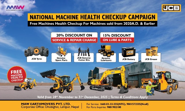 काठमाडौं । नेपालमा जेसीबीको अधिकृत डिस्ट्रीब्युटर एमएडब्लू अर्थमुभर्स प्रा. लि. ले सुरु गरेको सन् २०२० र त्यसअघि बिक्री भएका सबै जेसीबी मेसिनका लागि ‘नेशनल मेसिन हेल्थ चेकअप क्याम्पेन’ जारी छ। २० नोभेम्बरदेखि शुरु भएको क्याम्पेन ३१ डिसेम्बरसम्म संचालन हुने छ । यस अभियानले पुराना मेसिनलाई सुरक्षित, भरपर्दो र राम्रो अवस्थामा राख्न ग्राहकलाई सहयोग गर्ने उद्देश्य राखेको छ।