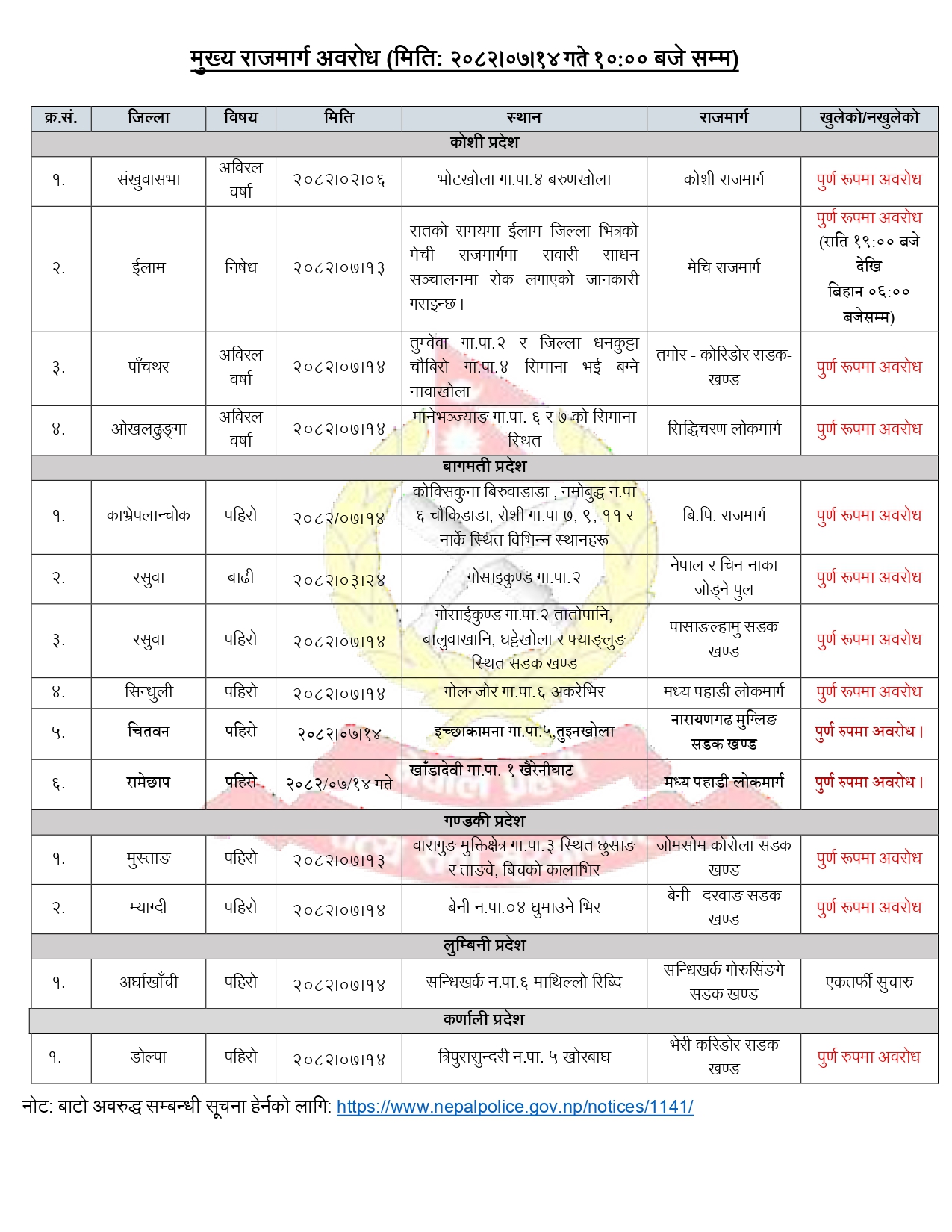 प्रहरी प्रधान कार्यालयका अनुसार कोशी राजमार्गअन्तर्गत पहिरोले सङ्खुवासभा खण्ड, पाँचथरमा तमोर करिडोर, ओखलढुङ्गामा सिद्धिचरण राजमार्ग, काभ्रेपलाञ्चोकको नमोबुद्धमा बिपी राजमार्ग, रसुवामा पासाङल्हामु राजमार्ग र नेपाल चीन जोड्ने पुल, सिन्धुलीमा मध्यपहाडी लोकमार्ग अवरुद्ध भएका हुन् ।