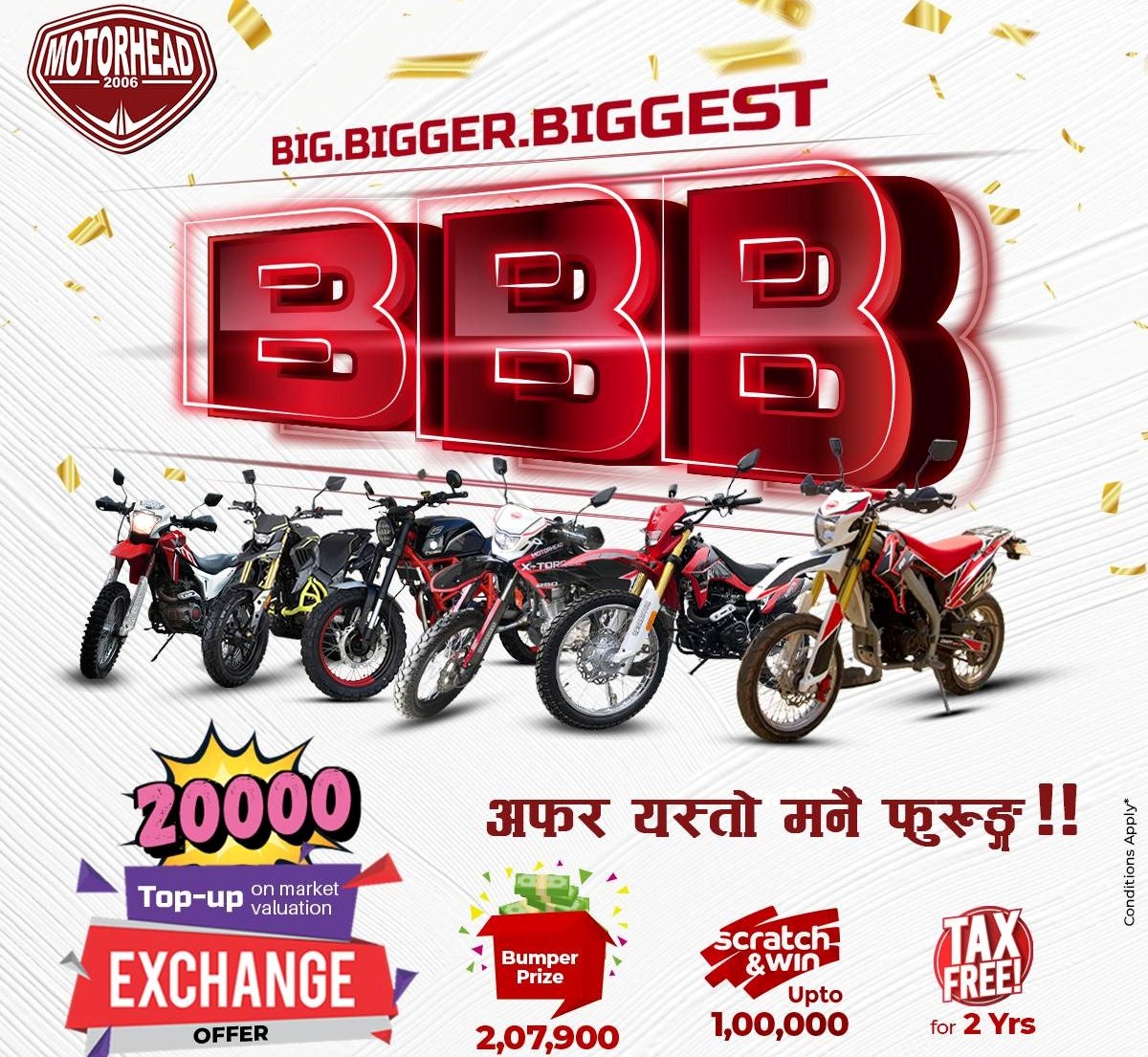 सो मितिबाट मोटरहेडका वाइक खरिद गर्ने आफ्ना ग्राहकलाई स्क्र्याच कुप, बम्परमा सहभागीको साथै २ वर्षको वार्षिक कर फ्रि हुने कम्पनीले जनाएको छ । जसमा स्क्र्याच गरी १ लाख रुपैयाँसम्म छुट पाउन सकिने र वम्परमा २ लाख ७ हजार ९ सय रुपैयाँ नगद उपहार जित्न सकिने छ ।