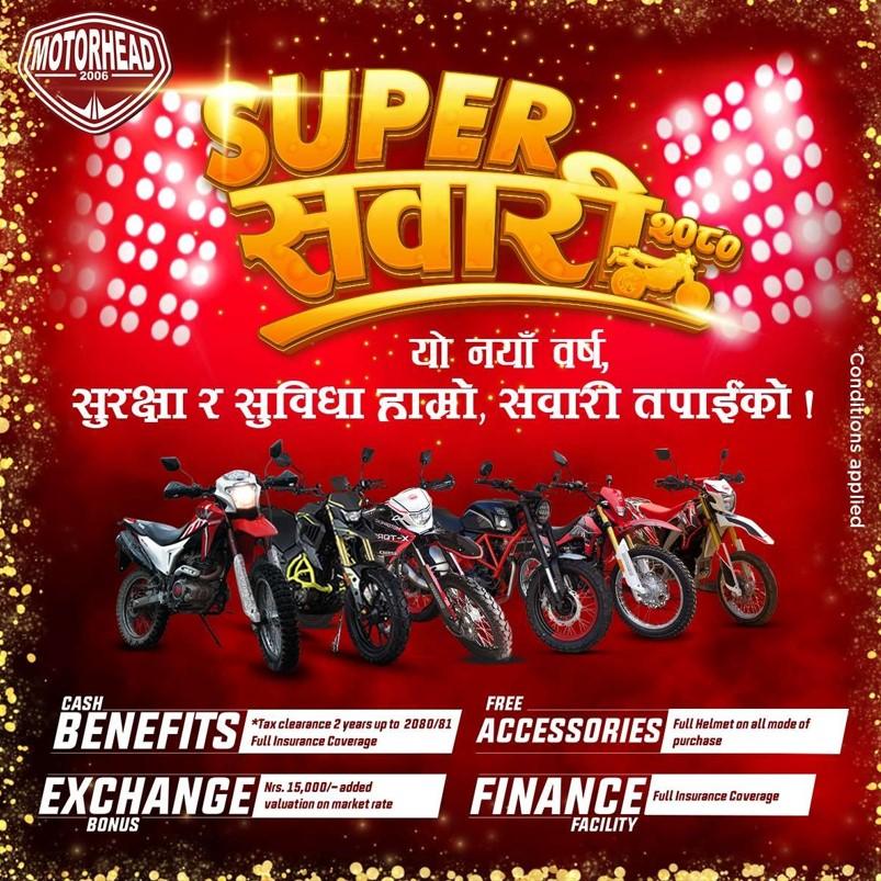 २०२१ मोडल तथा त्यस मुनिका मोडलहरुमा ‘Stock Clearance”अफर लागु कायम राख्दै कम्पनीले आफ्ना २०२२ मोडलका वाइकहरुमा “सुपर पावर २०८०, यो नयाँ वर्ष सुरक्षा र सुविधा हाम्रो, सवारी तपाईंको” नामक अफर यही चैत २४ गते शुक्रबारबाट कम्पनीले उपलब्ध गराउने बताएको छ ।