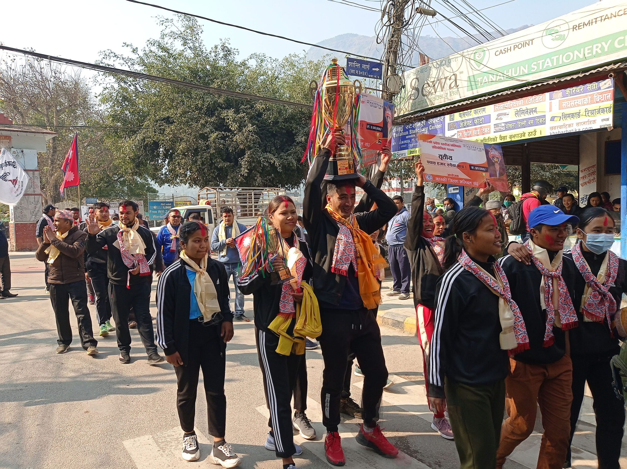 पोखरामा सम्पन्न मुख्यमन्त्री कप भलिबल प्रतियोगितामा पुरुषतर्फ प्रथम र महिलातर्फ तृतीय हुन सफल भएको तनहुँ जिल्लाको टिम आइतबार दमौलीमा ¥याली निकाल्दै । जिल्ला भलिबल सङ्घ तनहुँले खेलाडीलाई स्वागत एवं सम्मान गरेको हो । तस्वीर : कृष्ण न्यौपाने/ रासस
