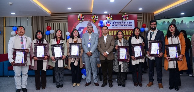 काठमाडौं । मुक्तिनाथ विकास बैंक लिमिटेडले १९औं वर्ष पुरा गरी २०औं वर्षमा प्रवेश गरेको अवसरमा पुष १९ गते देशभरी विविध कार्यक्रम सम्पन्न गरेको छ । बैंकले केन्द्रीय कार्यालय, लाजिम्पाट काठमाडौं, क्षेत्रीय कार्यालयहरु जनकपुर, नारायणगढ, धादिङ्ग, पोखरा, इटहरी, बुटवल र लम्कीमा आयोजित बृहत रक्तदान कार्यक्रममा कुल ७५५ युनिट रगत संकलन गरी स्थानीय रक्तसञ्चार गृहलाई हस्तान्तरण गरिएको छ ।