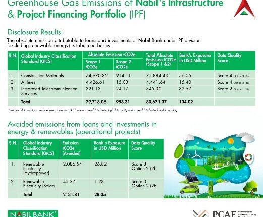 KATHMANDU: Nabil Bank has disclosed its greenhouse gas (GHG) emission report of year 2022 from bank’s loan and investments portfolio under Infrastructure and Project Financing (IPF) division. The report has made public as a part of commitment letter signed by Nabil Bank as one of the Partnership for Carbon Accounting Financials (PCAF) signatories in 2021.