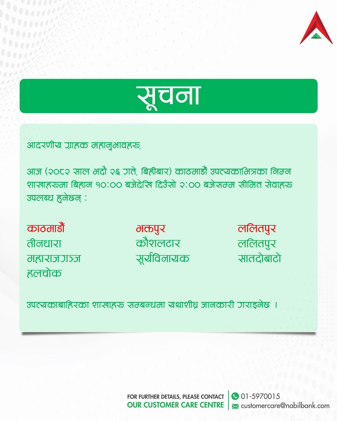 काठमाडौं । नबिल बैंकले काठमाडौं उपत्यकाभित्रका केही शाखामा मात्र आज (भदौ २६ गते, बिहीबार) सीमित सेवा सञ्चालन हुने जनाएको छ। बैंकका अनुसार बिहान १० बजेदेखि दिउँसो २ बजेसम्म सेवा उपलब्ध हुने व्यवस्था मिलाइएको छ ।