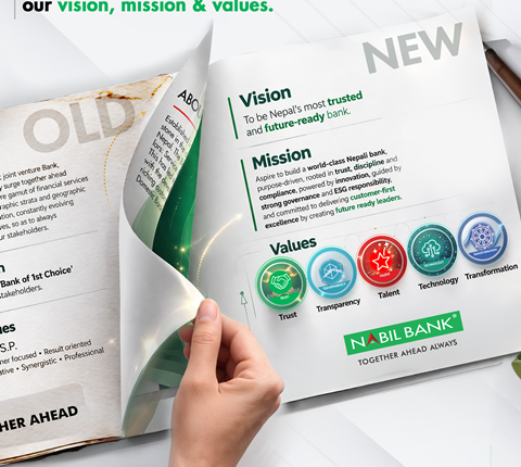 काठमाडौं। नबिल बैंक लिमिटेडले नयाँ वर्ष २०८३ को सुरुवातसँगै चार दशकदेखिका आफ्ना लक्ष्य, उद्देश्य र मूल्यमान्यतालाई पुनर्परिभाषित गरेको छ । यी पुनर्परिभाषित उद्देश्यले विश्वास, उत्थानशीलता र तयारीप्रति बैंकको प्रतिबद्धतालाई पुनस् पुष्टि गरेको बैंकले जनाएको छ। नबिल बैंकले ‘नेपालको सबैभन्दा विश्वासिलो एवम् भरपर्दो र भविष्यका लागि तयार बैंक बन्ने’ उद्देश्य लिएको छ।