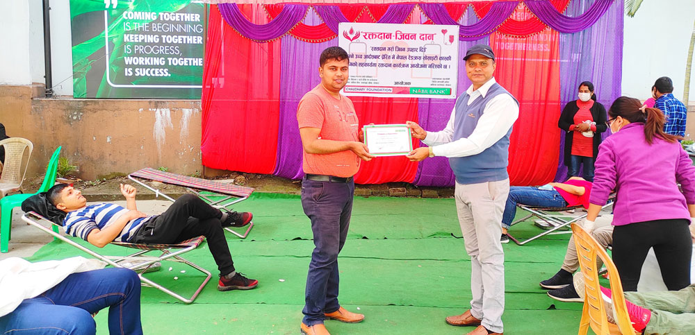 पोखरा । चौधरी फाउण्डेसन र नबिल बैंकको सहकार्यमा पोखरामा शनिबार रक्तदान कार्यक्रम सम्पन्न भएको छ । बैंकको न्युरोड शाखामा आयोजित कार्यक्रममा ५५ जनाले रक्तदान गरेका छन् ।