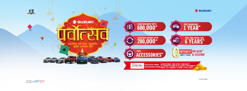 साथै सो अटो शोमा दशैं तिहार भरीका लागि लक्षित हुने गरी आकर्षक ग्राहक योजना ‘सुजुकी पर्वोत्सव अफर’ पनि सार्वजनिक गरिएको छ । यो योजना अन्तर्गत ग्राहकले ६ लाख रुपैयाँ सम्मको नगद छुट, १ वर्षको सवारी बीमा, ६ वर्षको लागि निः शुल्क पी.यम.एस पाट्र्स, २ लाख रुपैयाँ सम्मको एक्सचेन्ज बोनस र एक्सेसरिजहरु पाउन सक्नेछन् ।
