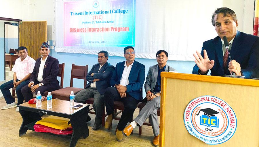 लेखनाथ । त्रिवेणी इन्टरनेशनल कलेज पोखरा २७ ले सफल व्यवसायी र विद्यार्थीबीच शुक्रबार अन्तरक्रिया कार्यक्रम सम्पन्न गरेको छ । अन्तरक्रिया कार्यक्रममा बोल्दै सफल व्यवसायी नारायणप्रसाद पौडेलले आफूले विदेशमा सिप सिकेर आफ्नो मातृभूमिलाई पछ्याउँदै नेपालमा फर्केर व्यवसाय संचालन गरेको बताए ।
