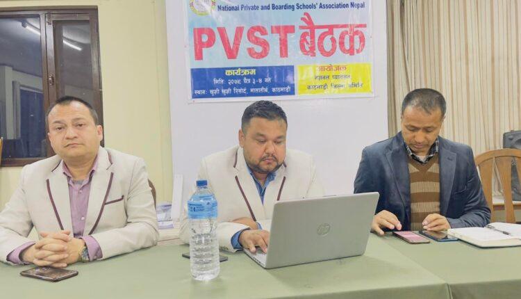 काठमाडौं । नेशनल प्याव्सन काठमाडौं जिल्ला कार्यसमितिको आयोजनामा काठमाडौंं जिल्ला अन्तर्गतका स्थानीय तहमा रहेका राष्ट्रिय निजी तथा आवासिय विद्यालय एसोसिएसन नेपाल (नेशनल प्याव्सन)को पिभिएसटी बैठक सम्पन्न भएको छ ।