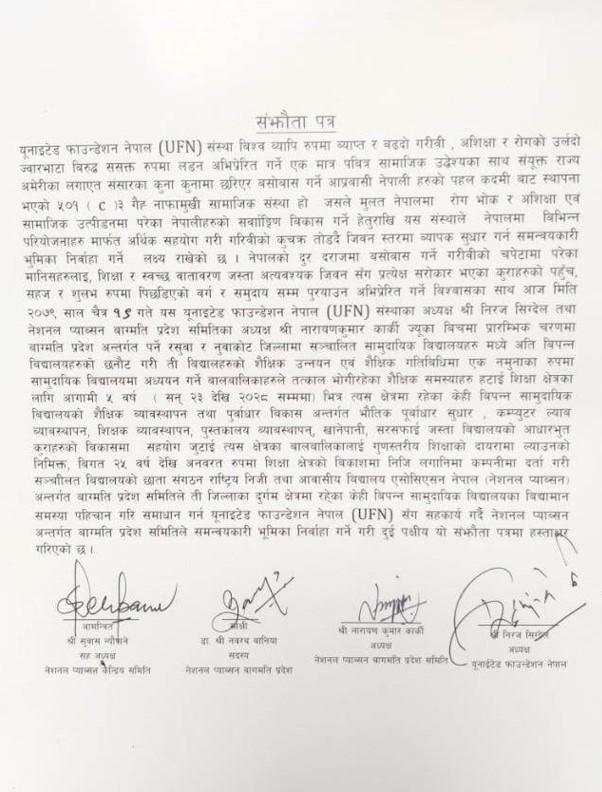 नेशनल प्याब्सन वागमती प्रदेश कार्य समिति र अमेरिकी गैरसहकारी संस्थाबीच वागमती प्रदेश अन्तर्गतका दुर्गम जिलाहरुमा अवस्थित र रसुवा र नुवाकोट जिल्लाका अति विपन्न केही सामुदायिक विद्यालायहरु परीक्षणको रुपमा छनौट गर्नेगरी ती विद्यालयका शैक्षिक गुणस्तर पूर्वाधारमा व्यापक सुधार गर्ने एक मात्र उद्देश्य लिई युनाइटेड फाउण्डेशन नेपालले आवश्यक आर्थिक स्रोत उपलब्ध गराउने र नेशनल प्याब्सन वागमती प्रदेश कार्य समितिले स्रोत परिचालन गरी विद्यालयको स्तर उकास्नेतर्फ ललितपुरको कुपण्डोलस्थित वागमती प्रदेश कार्य समितिको कार्यालयमा एक समारोहका बीच दुई पक्षीय सझौता पत्रमा हस्ताक्षर सम्पन्न भएकाे छ ।