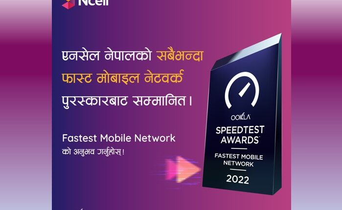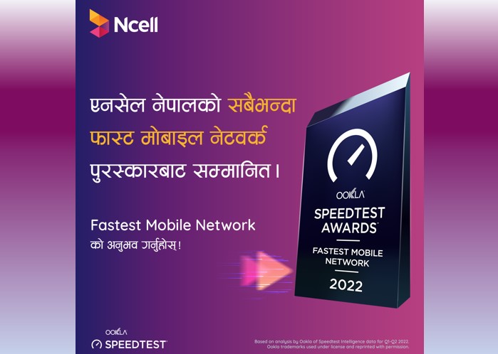 काठमाडौं । विश्वको अग्रणी मोबाइल र ब्रोडब्यान्ड नेटवर्क इन्टेलिजेन्स कम्पनी ऊक्लाबाट एनसेल आजियाटा लिमिटेडले जनवरी-जुन २०२२ को लागि नेपालको सबैभन्दा फास्ट मोबाइल नेटवर्क अवार्ड प्राप्त गरेको छ। एनसेलले आफ्नो मोबाइल डेटाको डाउनलोड र अपलोड गतिमा हासिल गरेको स्पीड स्कोरका आधारमा एनसेललाई यो सम्मान प्रदान गरिएको होे ।