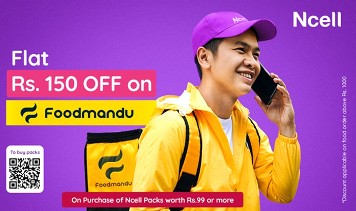 फागुन ५ देखि सञ्चालनमा आएको यो अफरमा, रु. ९९ वा सोभन्दा बढी मुल्य रहेका अफरमा समावेश कुनै पनि एनसेल प्याकको खरिदमा ग्राहकहरूले रु. १५० छुटको कुपन प्राप्त गर्दछन् । यो कुपन फुडमान्डुमा  रु. १,००० वा सोभन्दा बढी मूल्यका विभिन्न परिकारका अर्डरमा प्रयोग गर्न सकिन्छ ।