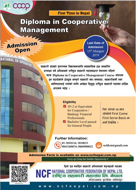 काठमाडौं । नेपालमै पहिलापटक डिप्लोमा इन को-अपरेटिभ म्यानेजमेन्ट (Diploma in Cooperative Management) कोर्ष संचालन हुने भएको छ ।